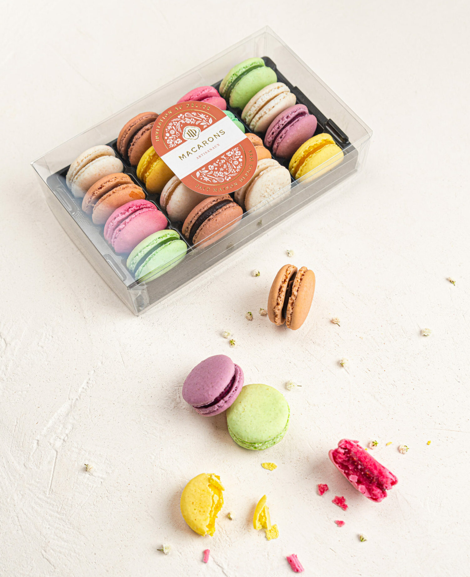Coffret de 16 Macarons en PVC transparent avec alvéoles qui englobent les macarons permettant de pouvoir transporter les macarons sans casse.