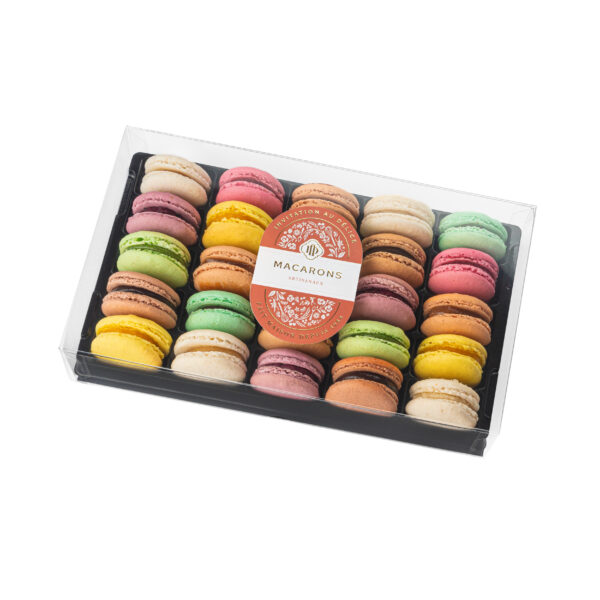 Coffret de 25 Macarons en PVC transparent avec alvéoles qui englobent les macarons permettant de pouvoir transporter les macarons sans casse. Parfums panachés